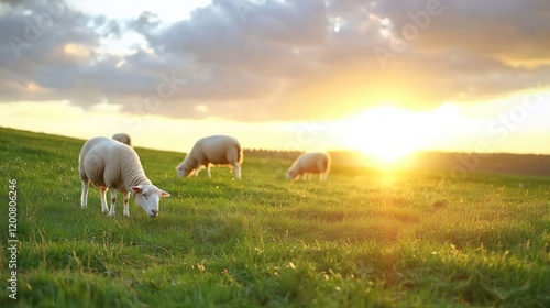 © Moza, Fototapeta premium Sheep grazing in a lush field during a vibrant sunset.