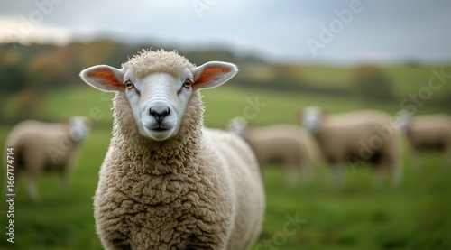 © olegganko, Naklejka premium Sheep Grazing in a Lush Green Field During a Cloudy Afternoon