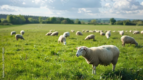 Fototapeta premium Sheep grazing in a lush green pasture on a sunny day
