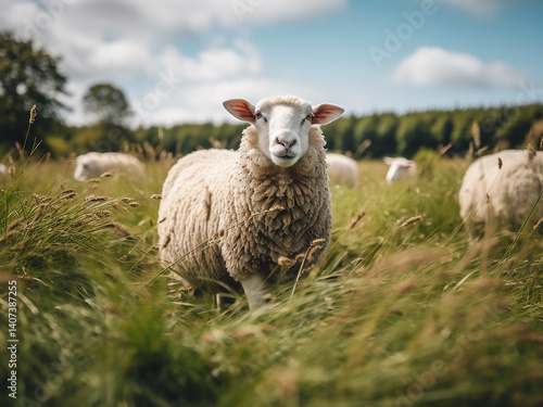 Obraz premium Sheep grazing in a peaceful pasture, cropping grass, with thick wool growing...