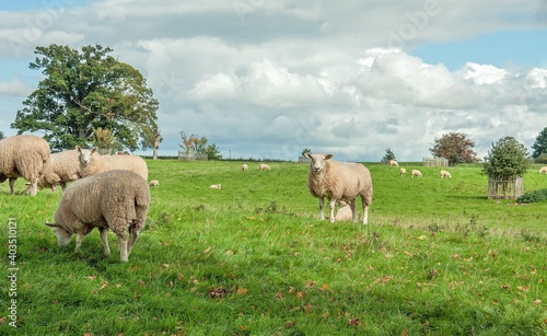 Obraz premium Sheep grazing in a springtime meadow.