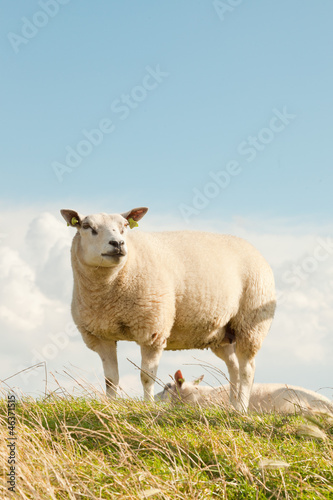 © ysbrandcosijn, Fototapeta premium Sheep grazing in field of grass. Dike. Blue cloudy sky.