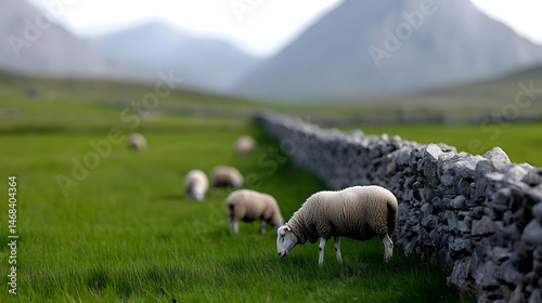 © Robin, Fototapeta premium Sheep Grazing Near Stone Wall In Green Meadow