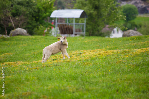 Obraz premium Sheep grazing on a flowering green field in Scandinavia