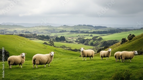 Fototapeta premium Sheep grazing on a lush green hill