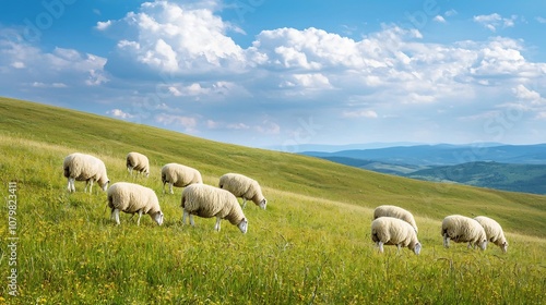 © Thares2020, Fototapeta premium Sheep grazing on a picturesque rolling hillside with a blue sky backdrop capturing rural simplicity and tranquil beauty