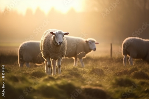 Obraz premium Sheep grazing on meadow at sunrise. Farm animal. Generative AI