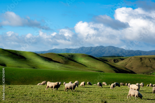 Fototapeta premium Sheep grazing on the vibrant rolling hilly farmland in rural New Zealand