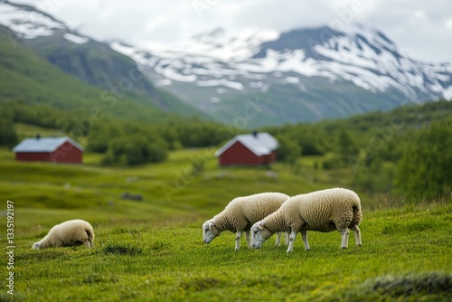 © Johanna, Fototapeta premium Sheep grazing peacefully on a lush green meadow with a farm in the background