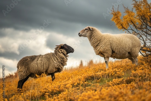 © Adisorn, Fototapeta premium Sheep in a golden field, autumn's colors stark and striking.