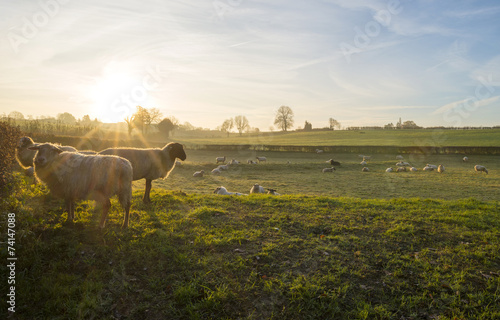 © Naj, Fototapeta premium Sheep in a meadow at sunrise in autumn