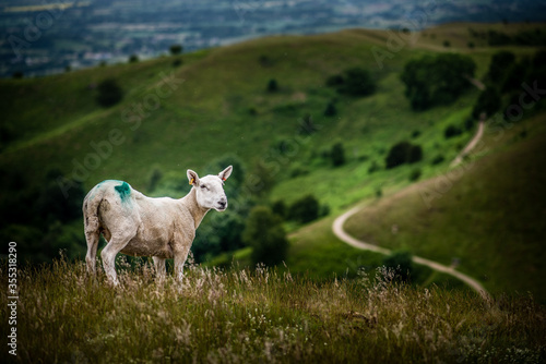 © JX, Obraz premium sheep in green meadow with winding path in background