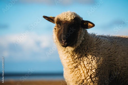 © Yauhen Leukavets, Fototapeta premium Sheep in the countryside. Sheep graze on a green meadow. Lovely lambs.