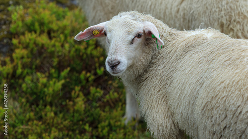 © Sergey Bogomyako, Naklejka premium Sheep in the green summer mountain forest in Norway