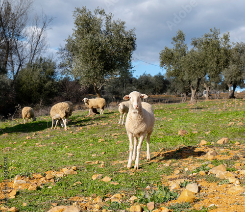 Fototapeta premium sheep looking at the camera in a field of olive trees
