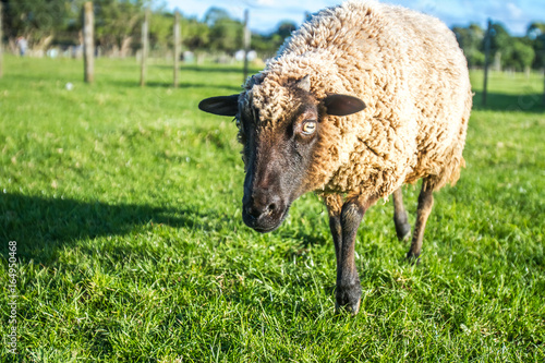 Fototapeta premium sheep on a farm, green grass background