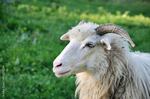 © Yevhenii, Fototapeta premium Sheep on a green field