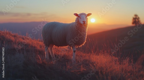 Fototapeta premium Sheep on hill with sunset background, grass in foreground