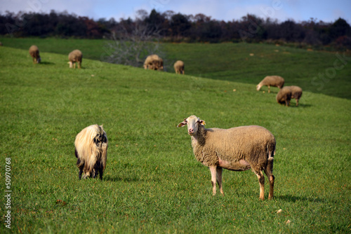 © hikrcn, Obraz premium sheep on pasture eating grass