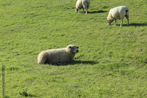 Fototapeta premium Sheep on the green dyke at Bensersiel, Northern Germany