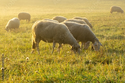 © Valeria, Fototapeta premium Sheep on the meadow eating grass in the herd during colorful sunrise or sunset. Slovakia