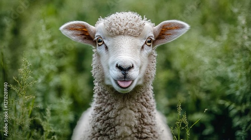 Naklejka premium Sheep playfully sticking out its tongue, a moment of lighthearted charm.
