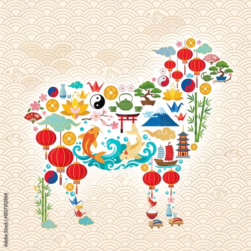 Fototapeta premium Sheep shaped with Asian cultural symbols