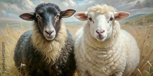 Fototapeta premium Sheep standing in a golden field. A symbolic image of diversity, rural charm,...