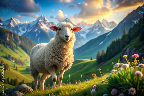 © pola, Fototapeta premium Sheep Standing in a Mountainous Meadow at Sunset