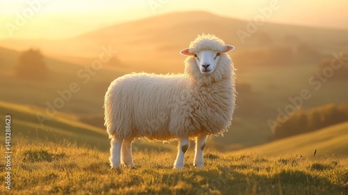 Fototapeta premium Sheep standing in sunlit meadow with grassy hills, sunny skies and warm light