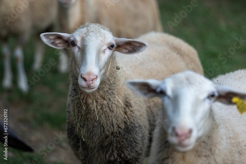 Fototapeta premium Sheep standing side-by-side in a lush green grassy field, in an idyllic outdoor setting