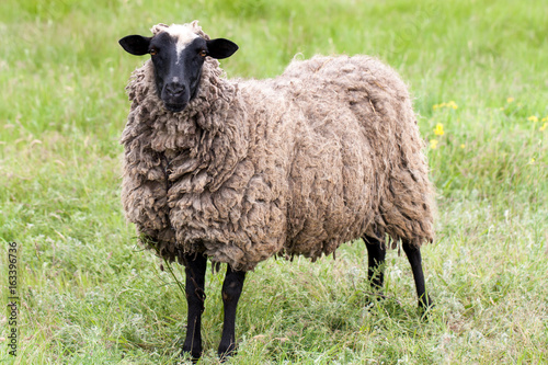 Naklejka premium Sheep with dirty wool grazing in a meadow
