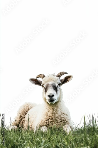© Murda, Fototapeta premium Sheep with horns in grass, looking at camera.