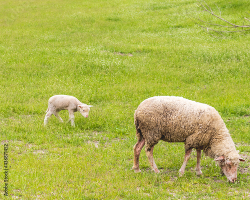 Fototapeta premium Sheep with lamb graze on pasture