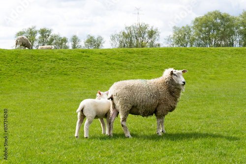 Obraz premium Sheep with young sheep on the pasture in Northern Germany