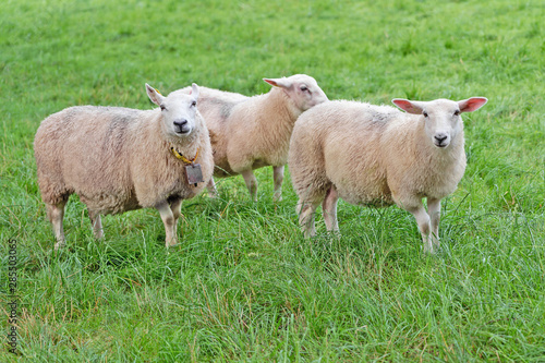 Fototapeta premium Sheeps grazed on green grass field pasture