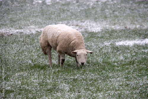 Naklejka premium sheeps in snow at the lowest polder in the Netherlands Zuidplaspolder between...