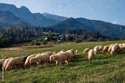 Fototapeta premium Sheeps on a green hill, mountains as a background