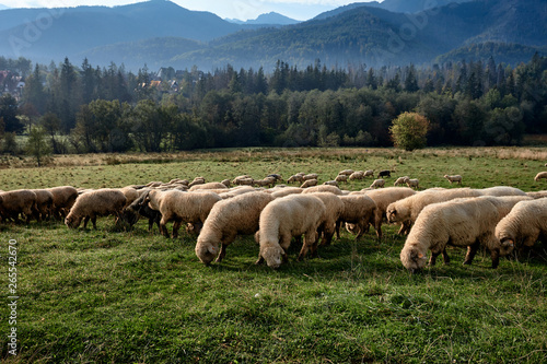 Fototapeta premium Sheeps on a green hill, mountains as a background