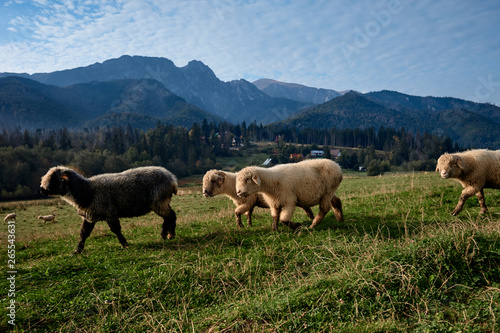 Fototapeta premium Sheeps on a green hill, mountains as a background