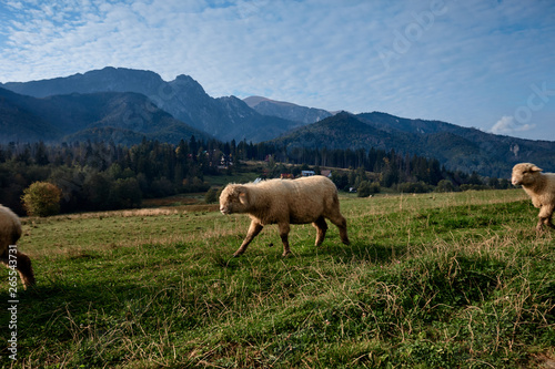 Fototapeta premium Sheeps on a green hill, mountains as a background