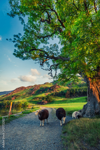 © shaiith, Naklejka premium Sheeps on footpath in the Lake District at sunset, England