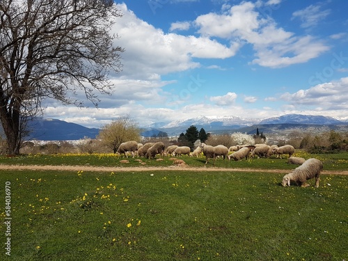 © sea and sun, Fototapeta premium sheeps on meadow in spring season green grass in ioannina greece