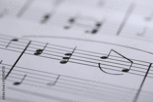 © New Africa, Fototapeta premium Sheet with musical notes as background, closeup