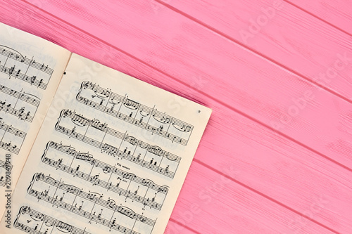Fototapeta premium Sheet with musical notes, copy space. Paper with music notes on pink wooden...