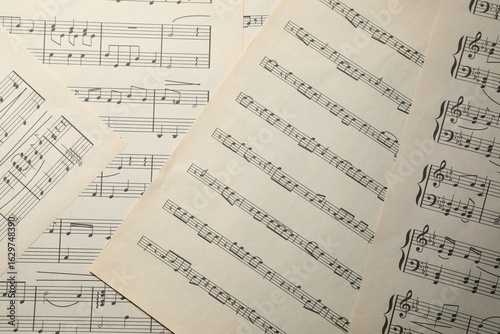 © New Africa, Obraz premium Sheets with musical notes as background, top view