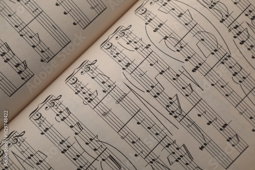 © New Africa, Obraz premium Sheets with musical notes as background, top view