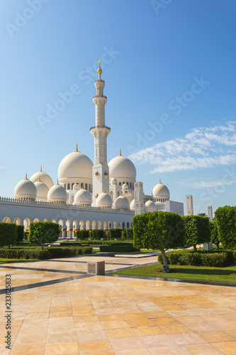 Fototapeta premium Sheikh Zayed Mosque - Abu Dhabi, United Arab Emirates. Beautiful white Grand Mosque view from exerior of one of the 4 minarets and part of the garden.