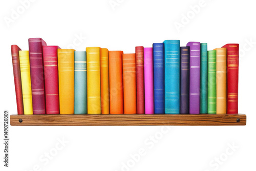 © Irfan Mulyana, Naklejka premium Shelf books with colorful spines on wood and knowledge theme