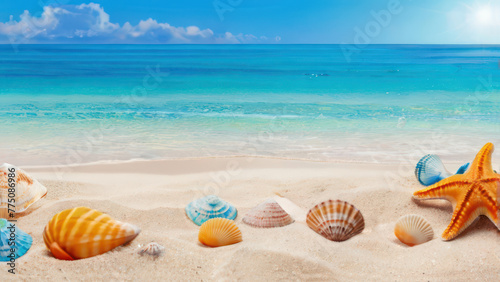 © Olha Vietrova, Obraz premium shells and starfish on the ocean beach